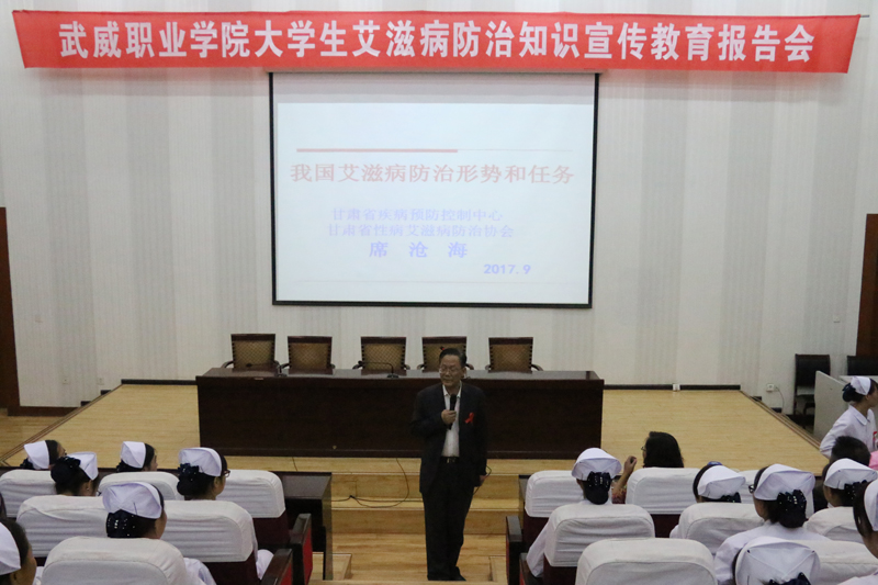 9月21日晚,甘肅省性病艾滋病防治協(xié)會副會長、甘肅省艾滋病首席專家、主任醫(yī)師席倉海教授在學院正德廳為我院學生作了一場“大學生艾滋病防治知識宣傳教育”講座,講座由市疾控中心主任楊天琳主持,學院護理系黨總支書記張建輝、市疾控中心性病艾滋病科科長王永瑚、市中心血站血源科科長邢志勇及學院各級團干部和紅絲帶協(xié)會共280多人聆聽了講座。
