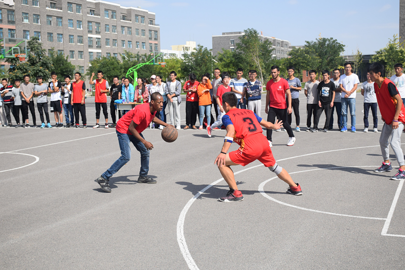 在籃球場上,留學(xué)生和學(xué)院學(xué)生展開了籃球友誼交流賽,他們本著“友誼第一,比賽第二”的精神開展籃球交流,經(jīng)過激烈的角逐,留學(xué)生代表隊以一分的優(yōu)勢獲勝。賽后,中外球員互相擁抱并合影留念。