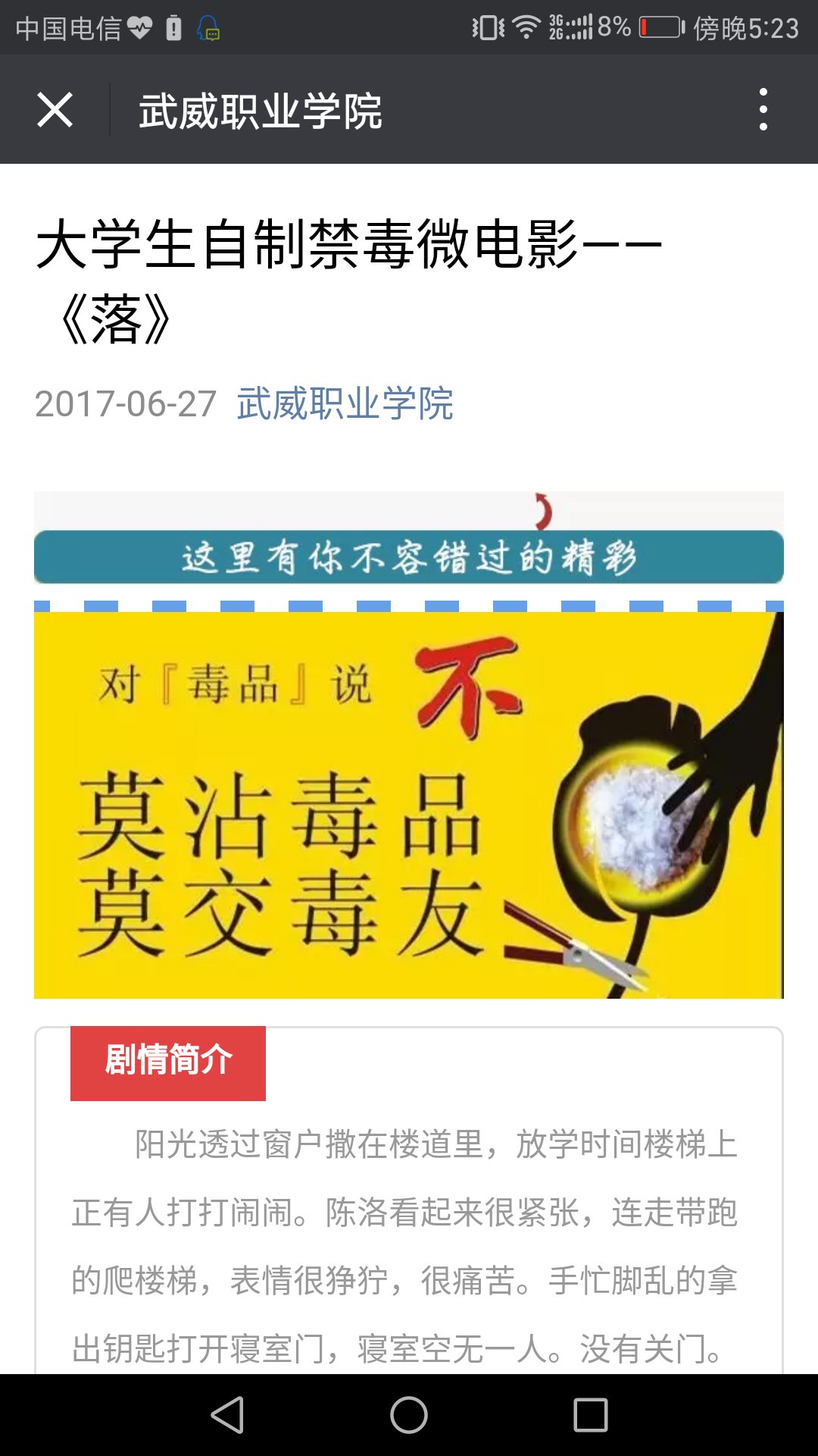 宣傳周期間,利用校園廣播、宣傳欄、新媒體等多種載體以及懸掛宣傳標語、召開“無毒青春,健康生活”主題班會、觀看禁毒影片等多種形式,向廣大師生講述了新型毒品的種類、毒品對個人、對家庭、對社會的危害以及作為當代大學生應(yīng)如何樹立正確的人生觀和價值觀,潔身自好,抵制誘惑,避免誤入歧途等常識。