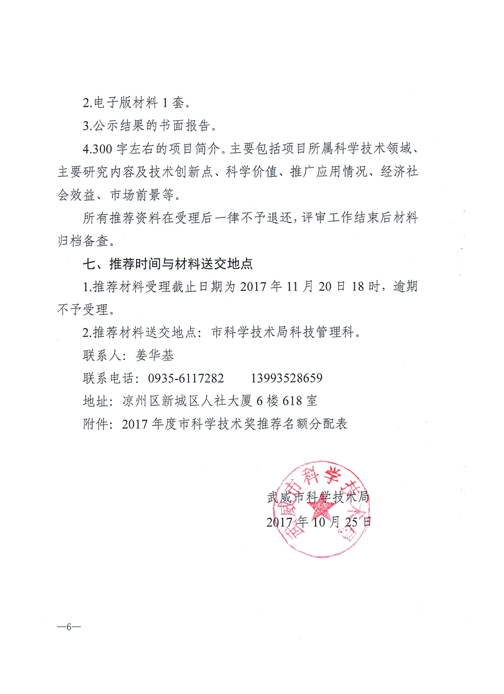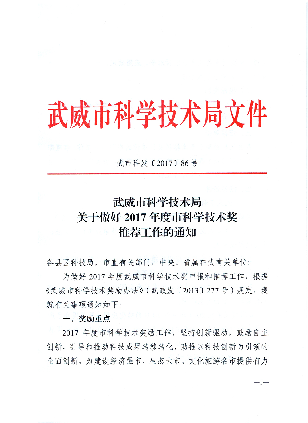 轉發(fā)武威市科學技術局關于做好2017年度市科學技術獎推薦工作的通知